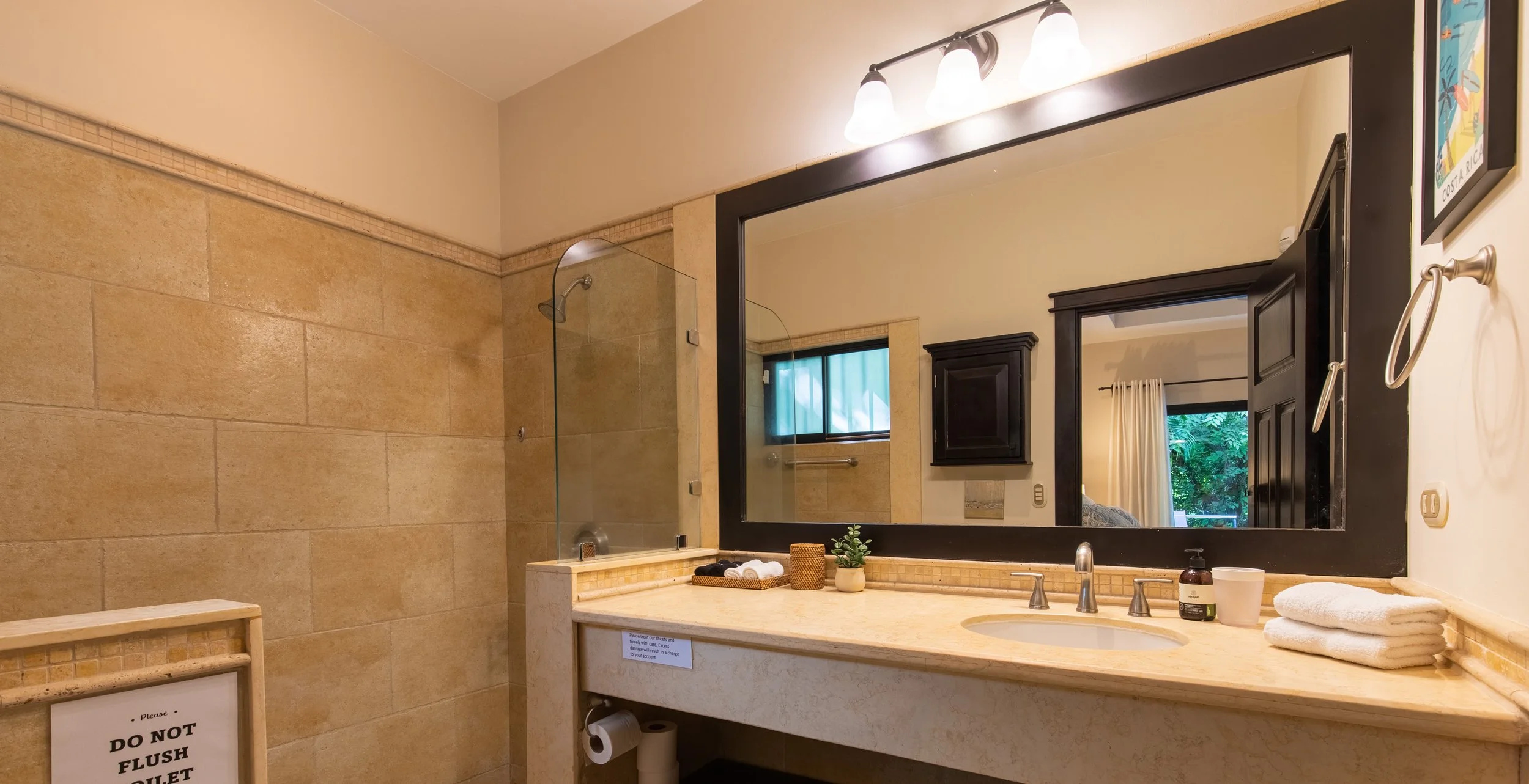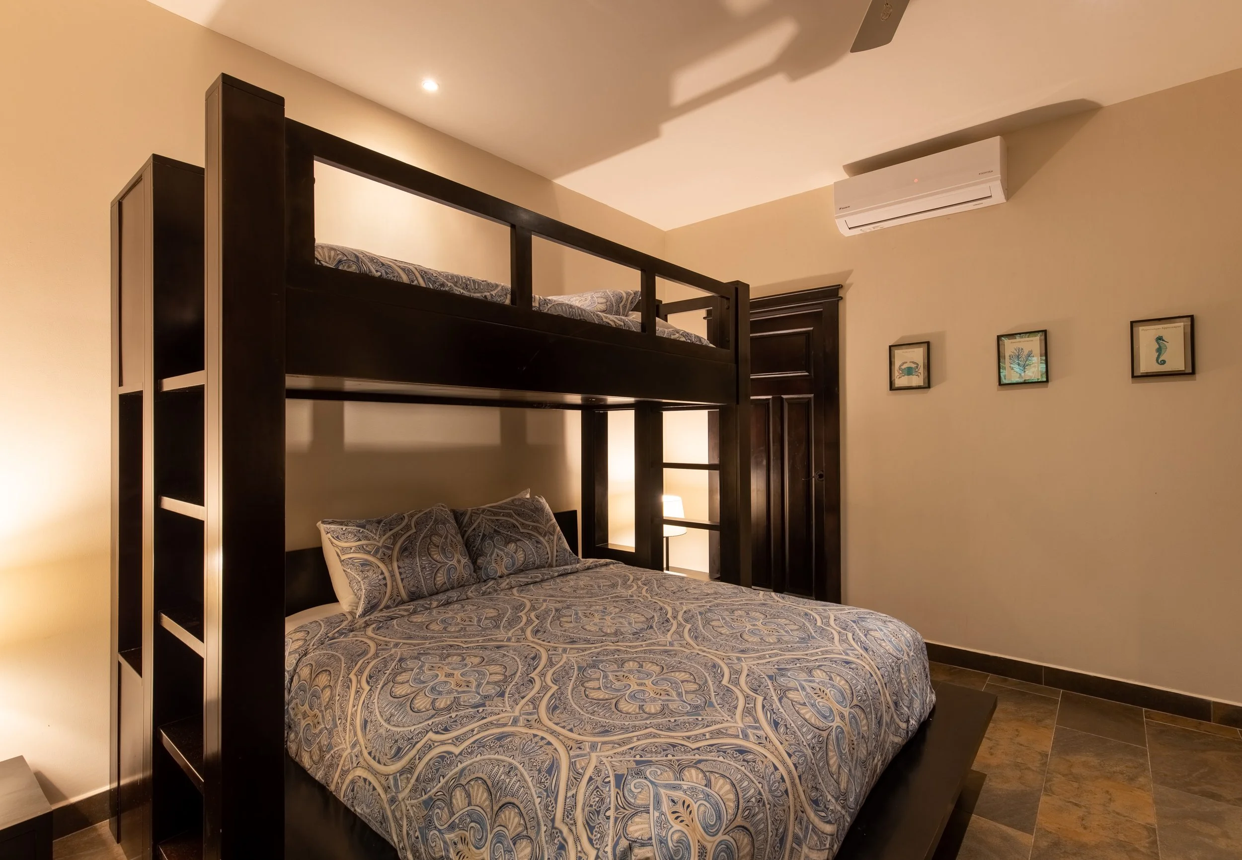 Each guest house features three bedrooms, three and half bathrooms, a kitchen, seating area, air conditioning, and flat-screen TV.